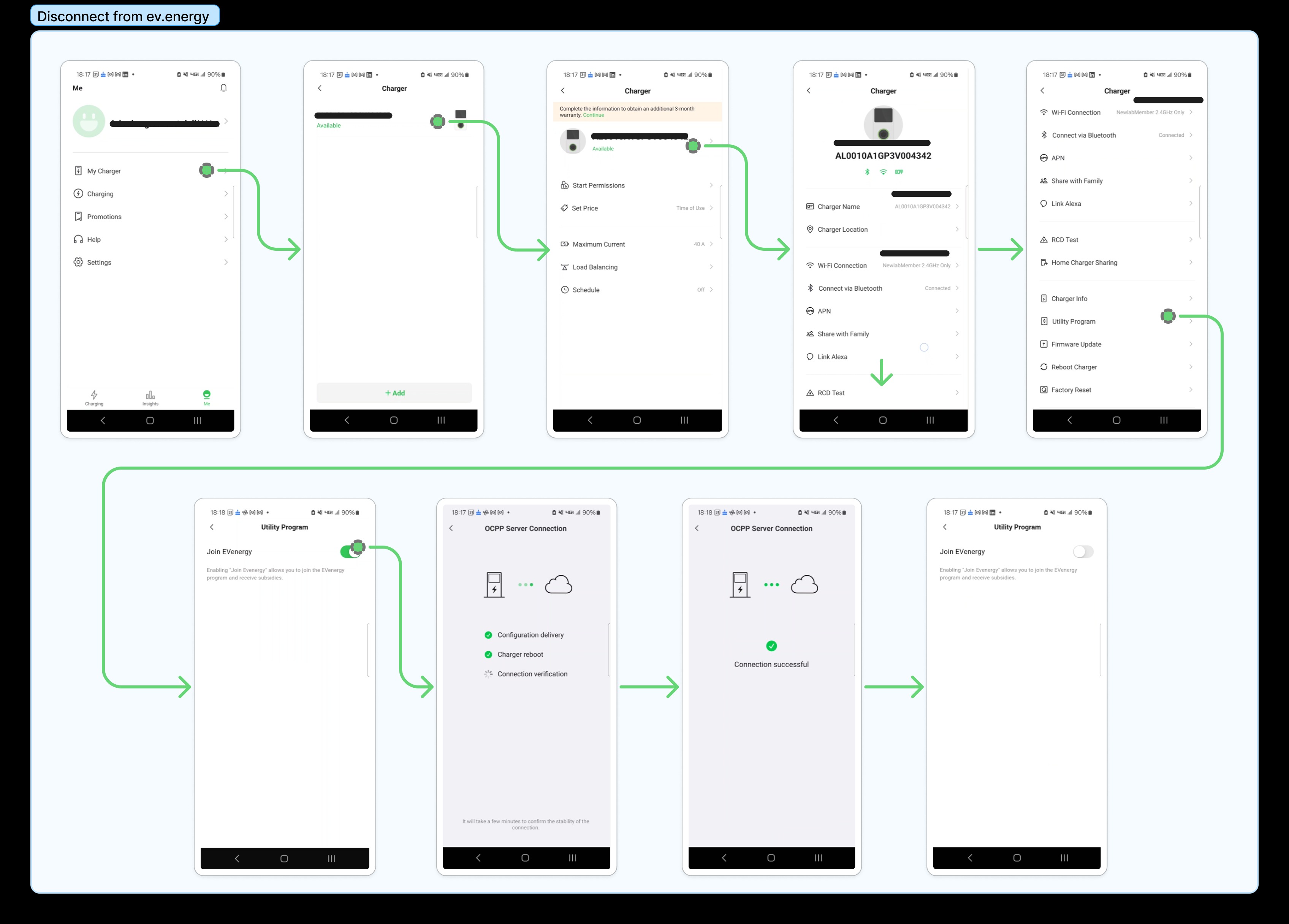Confirm Connection: Your charger will then initiate an OCPP (Open Charge Point Protocol) handshake to point its data toward our servers. Once the screen displays "Connection successful," your charger is ready to be finalized in the ev.energy app.